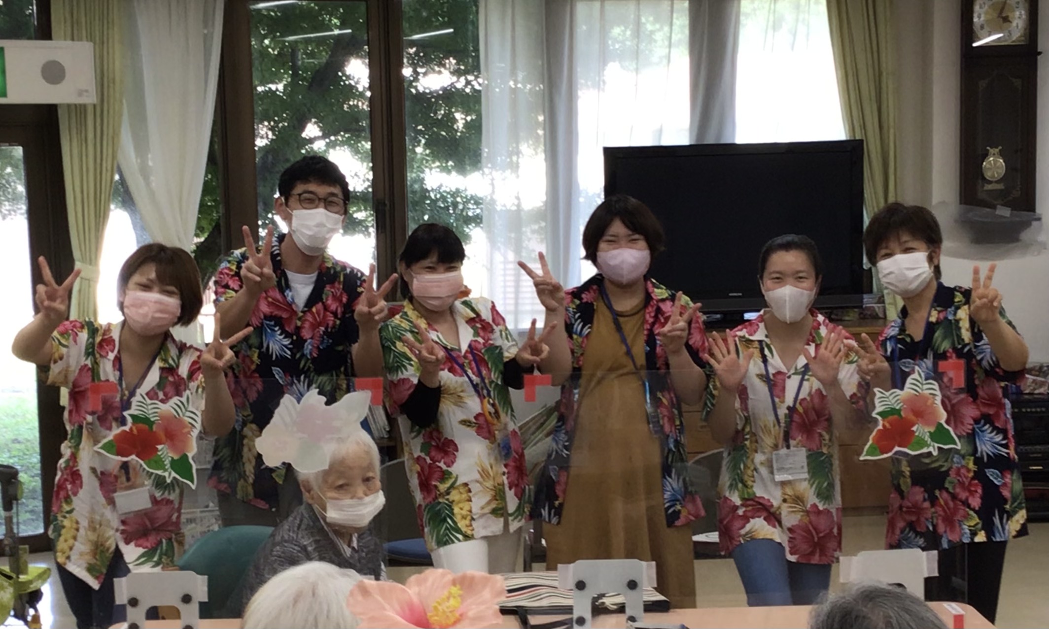 ロコモコといえば「ハワイ」ということで、デイフロア内をハワイカラーで飾り付けし、職員もアロハシャツを着て気合十分( •̀ ω •́ )✧