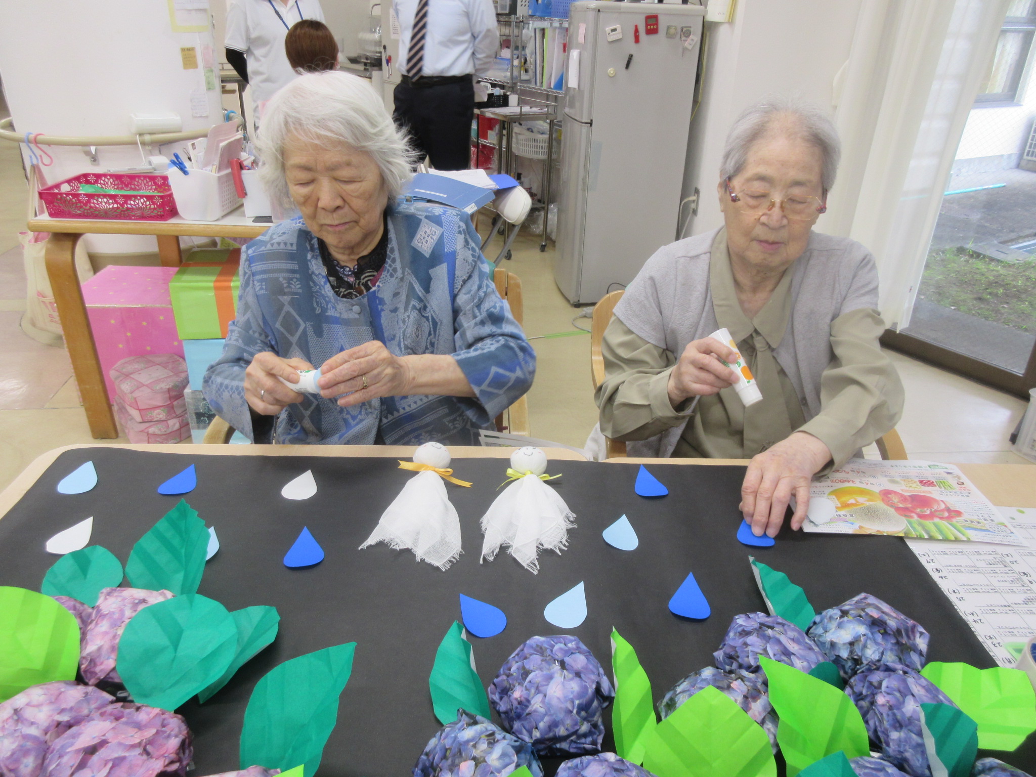 新聞紙を丸め、アジサイに見立てています(❁´◡`❁)