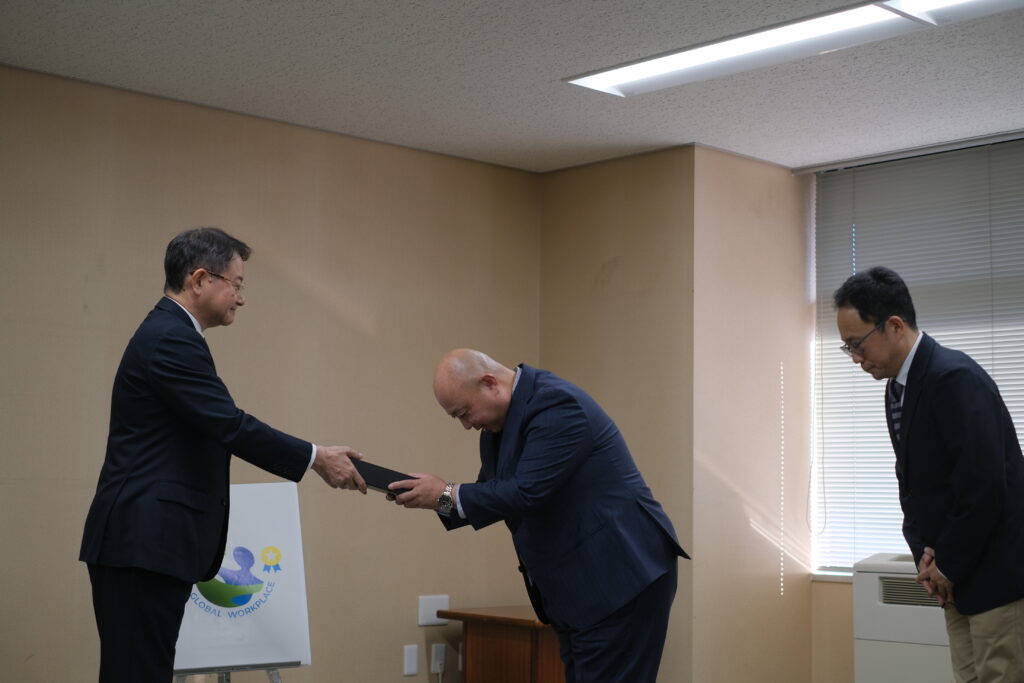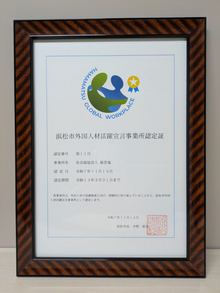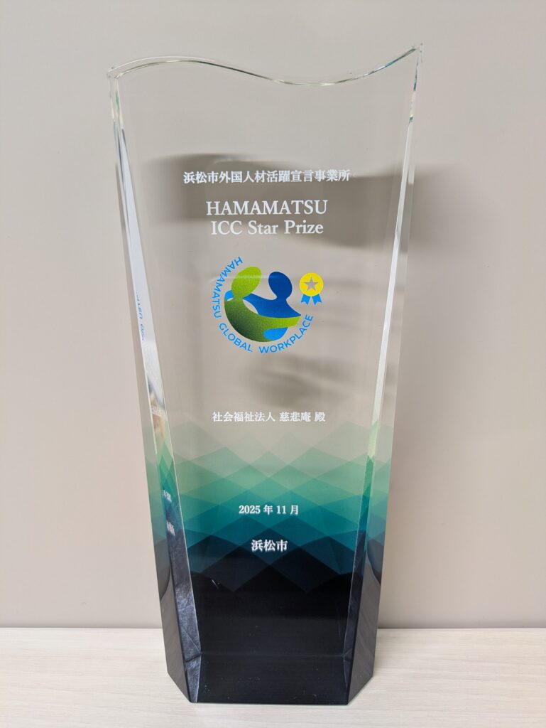 令和3年度に浜松市が創設した「浜松市外国人材活躍宣言事業所」に認定されていた当法人は、外国人材が安心・安全に働くことができる就労環境づくりや能力発揮・活躍促進などを積極的また継続的に取り組んでまいりましたが、この度その成果が認められ、令和7年11月14日、「HAMAMATSU Intercultural City Star Prize 事業所」に認定されました。